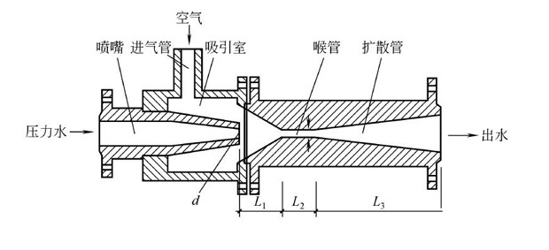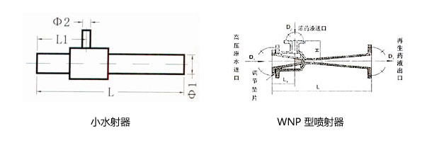 水射器原理 高壓原水通過管道閥門進入噴射器的漸縮段,將靜壓頭轉換成動能,在噴嘴處成為高速射流,使混合室形成微真空狀態,將高濃度的再生藥液吸入混合室,并使再生藥液的壓力和速度發生變化;在混合段內,水和藥液得到充分地混合,然后注經擴散段,使再生液減低流速,靜壓頭升高,再通過出口管道及閥門將稀再生液送到交換器本體中。